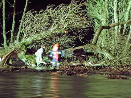 | Die Stadt Kierspe hat zuvor das THW Halver angefordert, um vorbeugend einige unter der Schneelast umgestützte Bäume entlang der Volme zu beseitigen, die bei der nächsten Schneeschmelze als Abflusshindernisse die Volme anstauen würden. So wird bei Wilmersberg eine große Fichte mit der Kettensäge zerlegt und mit der GKW-Seilwinde aus der Volme gezogen. Weitere Einsatzstellen im Volmetal werden gemeinsam mit André Wirth von der Stadt Kierspe begangen, können aber noch nicht abgearbeitet werden, da sich die Lage im Lauf des Tages zuspitzt. |